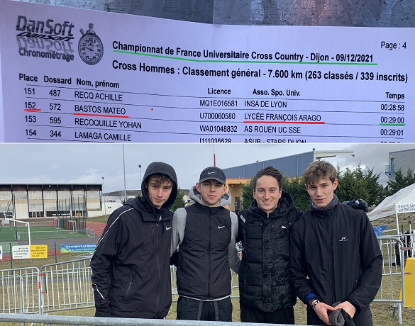 Mateo Bastos représentait son lycée François Arago de Reims à ces championnats. Il termine 152e. Il est en compagnie sur la photo de Fabien PALCAU (le 3e en partant de la gauche) nouveau champion France Universitaire qui est double champion d’Europe de Cross et vice champion 2020 sur 5000m (13’35), a 2"de Jimmy Gressier.