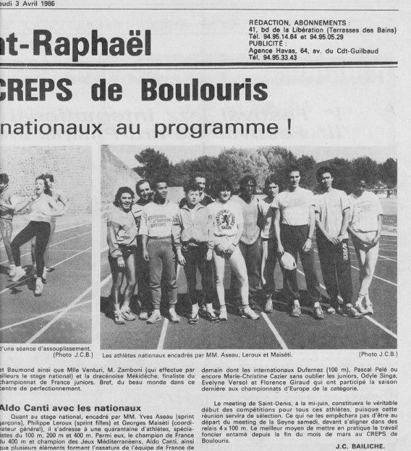 Stage de l’équipe de France à Boulouris en 1986. Sur la droite de la photo se trouve une jeune athlète (Marie-Jo Pérec) qui va devenir un peu plus tard, triple championne olympique sur 200 et 400m plat.